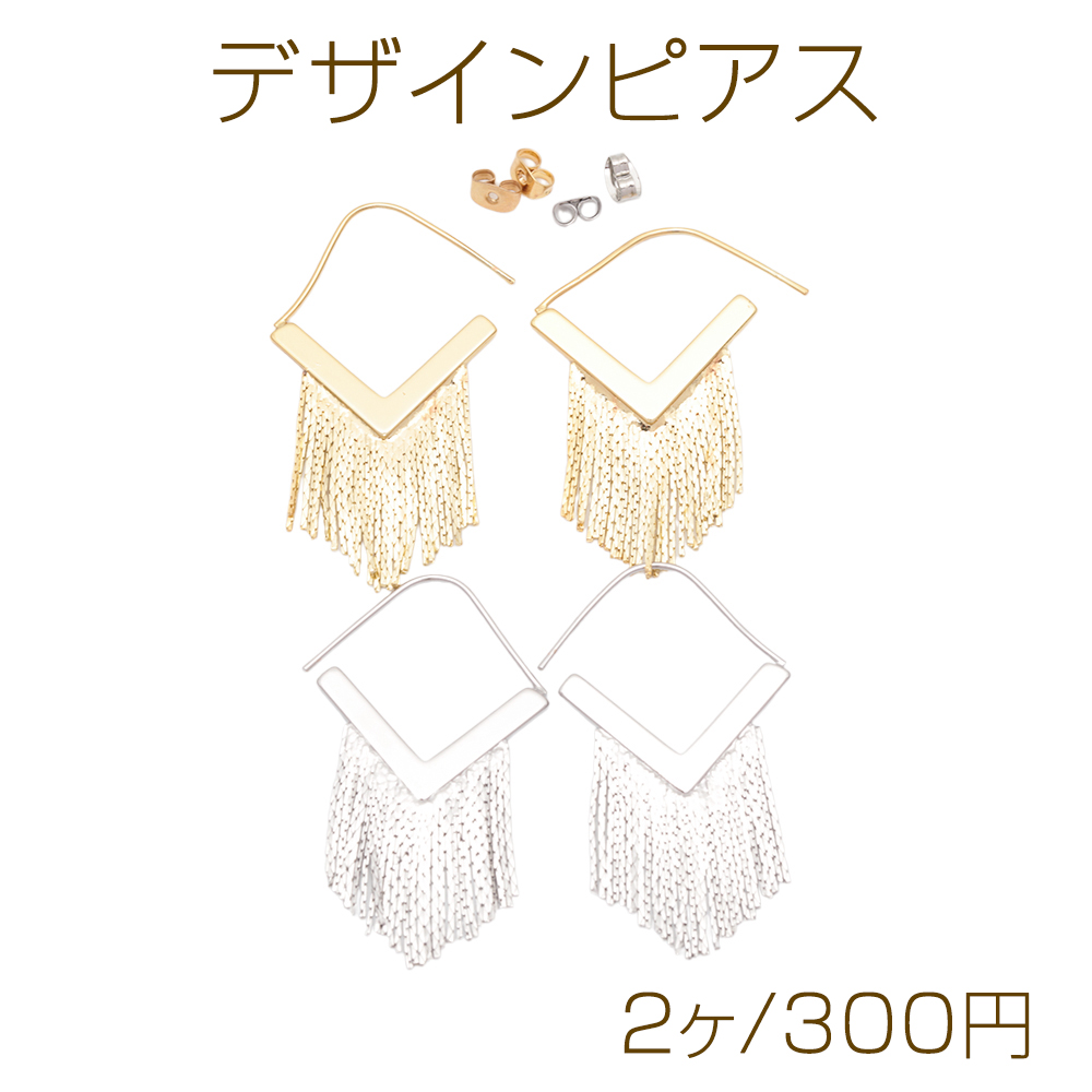 デザインピアス V字 チェーンタッセル メタルピアス 約28×36mm(2ヶ)