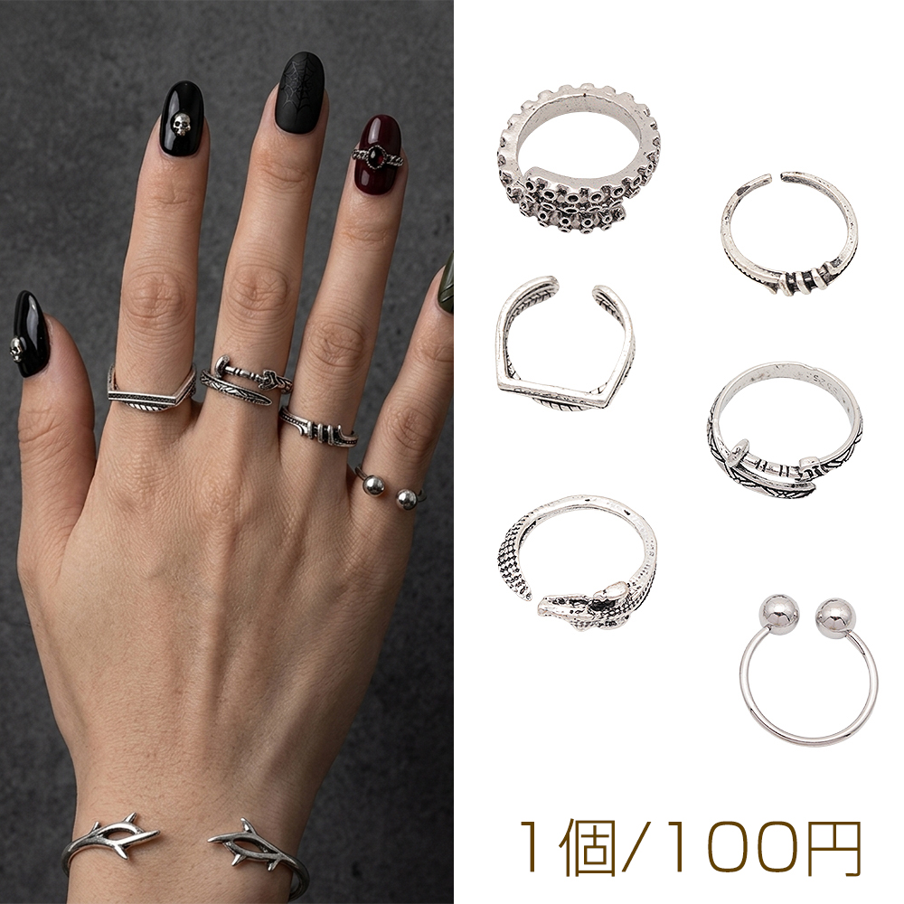 デザインリング 個性的 ヴィンテージ風 アンティークシルバー メタルリング オープンリング 全6種(1個)