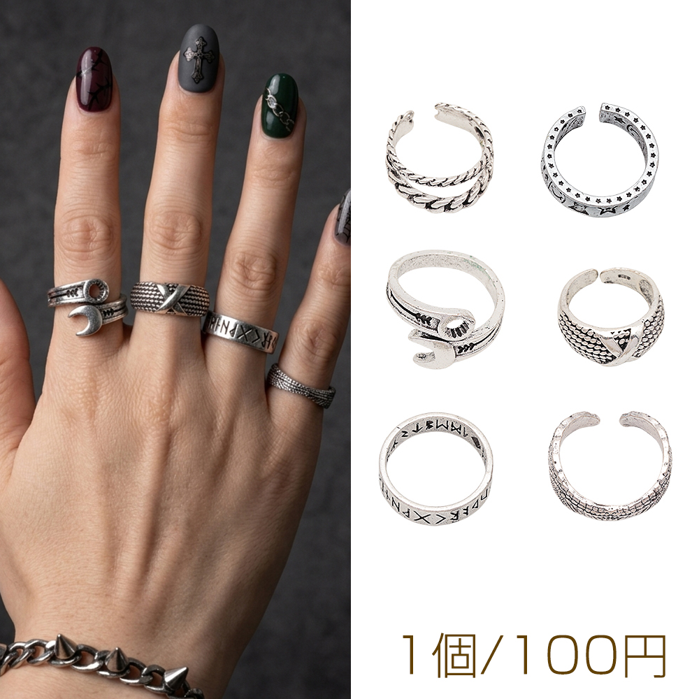 デザインリング 個性的 ヴィンテージ風 アンティークシルバー メタルリング オープンリング 全6種(1個)