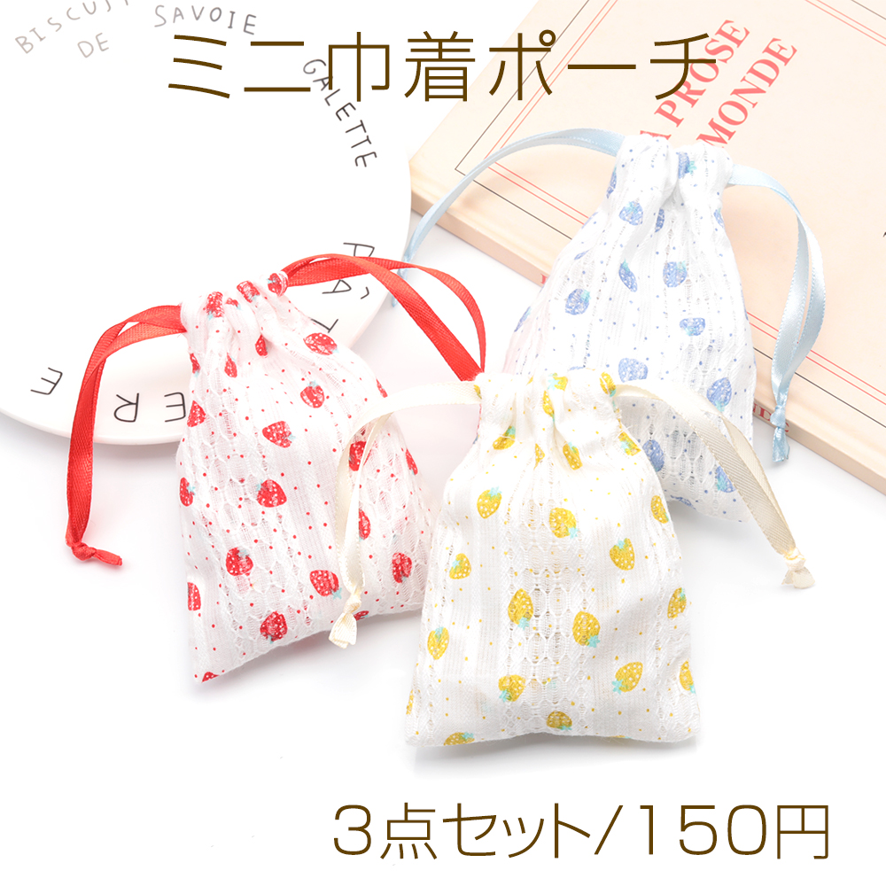 ミニ巾着ポーチ3点セット 大人可愛い いちご柄 小物入れ プチギフトにも (3点セット)