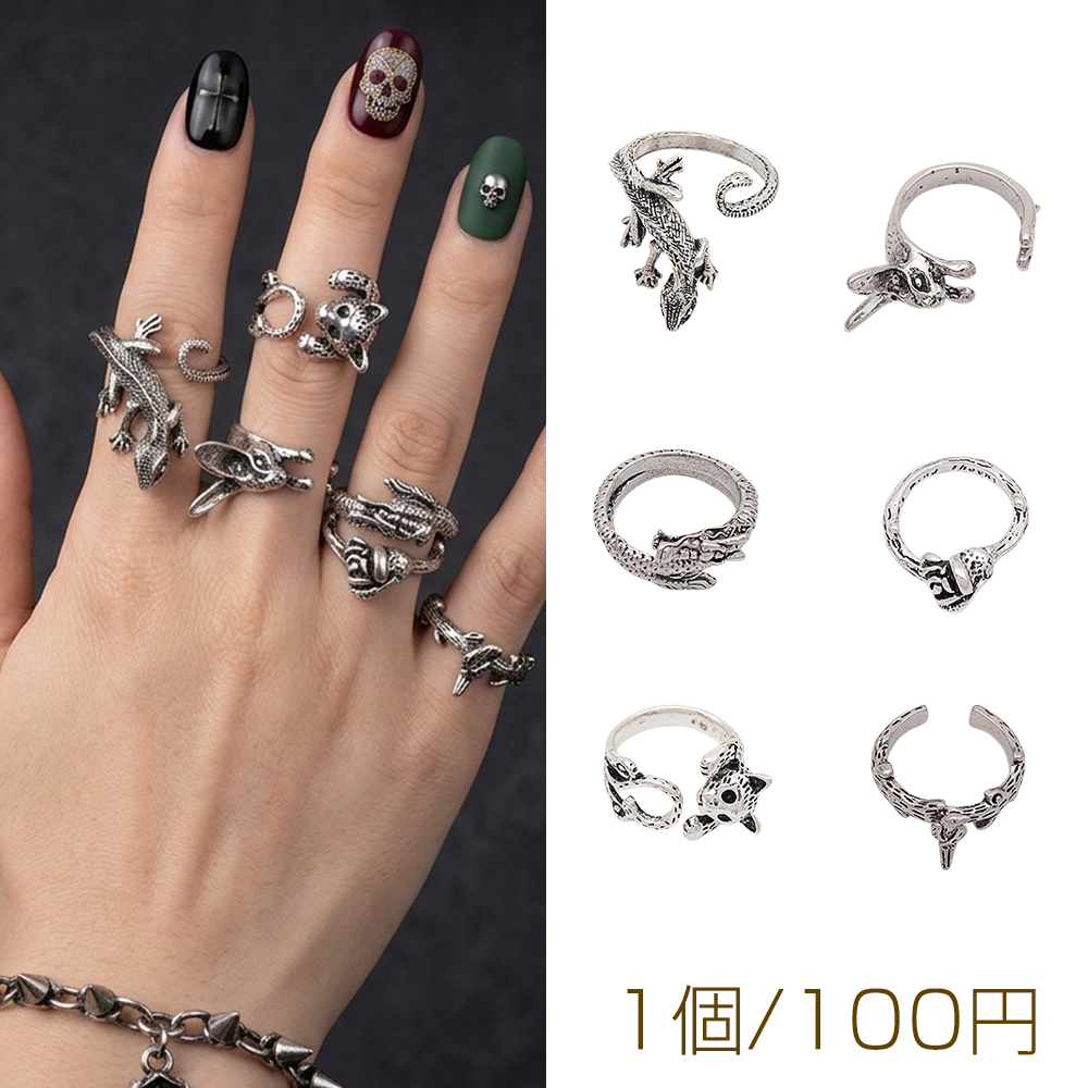 デザインリング ユニーク アニマルデザイン ヴィンテージ風 アンティークシルバー メタルリング オープンリング 全5種(1個)
