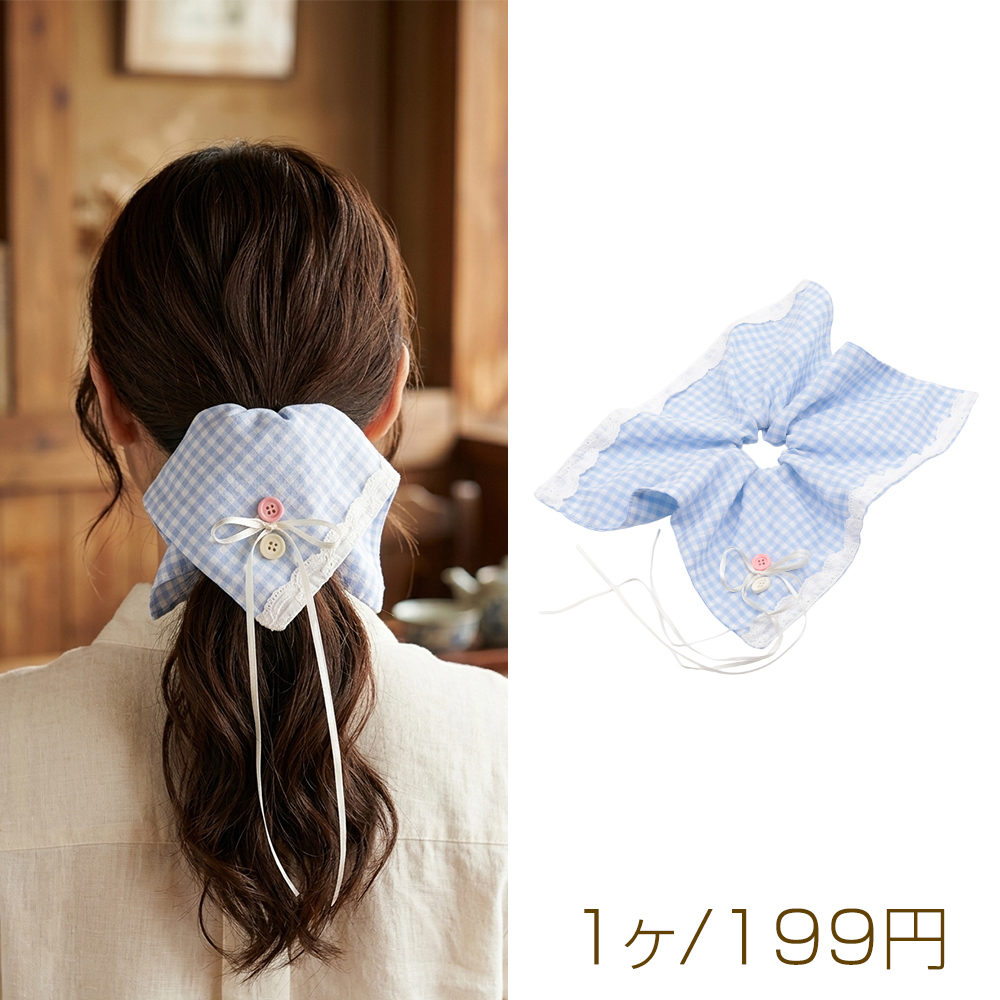シュシュ チェック&ドット柄 2層レース フラワーモチーフ パール付き 髪飾り 髪留め ヘアゴム ヘアアクセサリー(1ヶ)